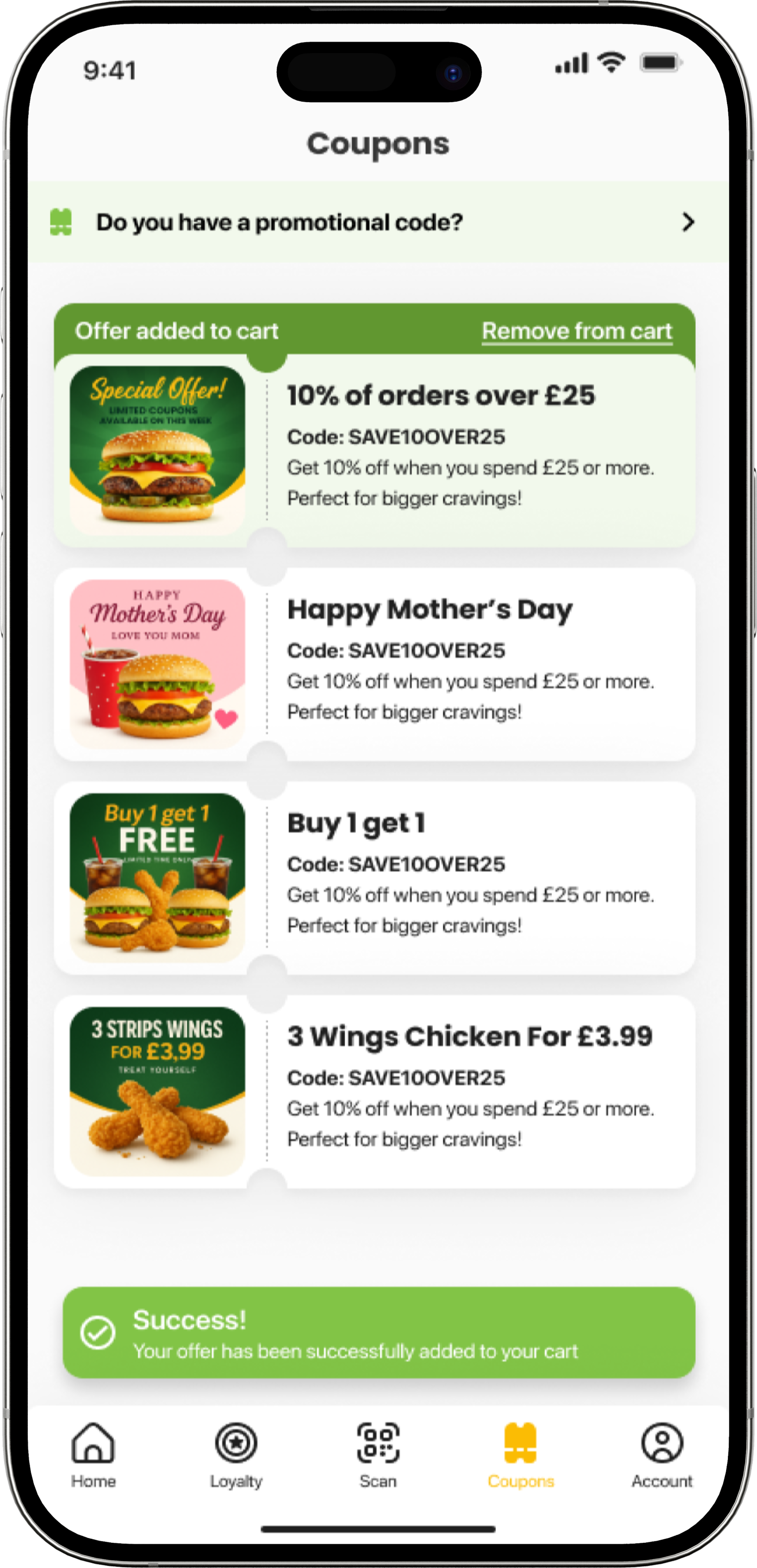Set up first-order discounts, happy-hour deals, or seasonal campaigns. Promote them directly on your ordering website.